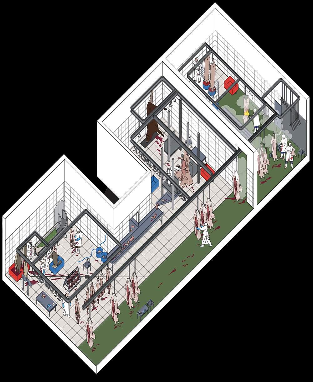 L’image présentée ici est une axonométrie du hall d’abattage d’un des abattoirs choisi comme terrain d’étude.