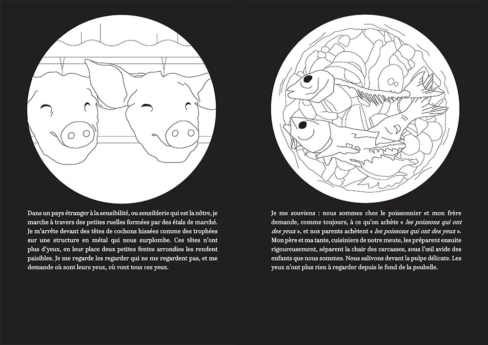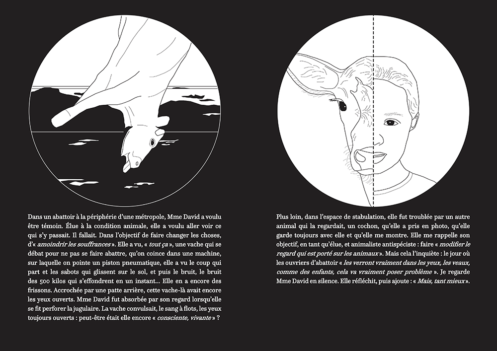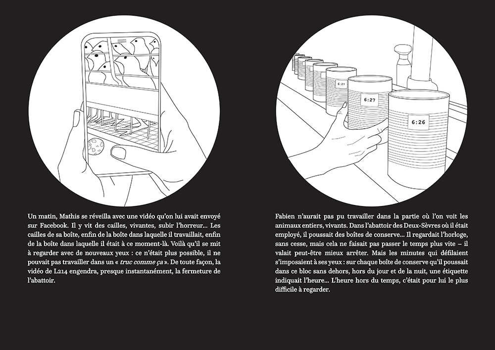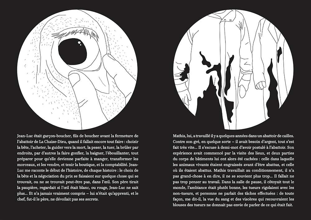 Ce récit a été présenté lors de l’Ecole d’hiver de la Graduate+ ARTS (« Méthodologies et pratiques de la recherche en arts »), afin d’illustrer la méthodologie envisagée pour ce travail de recherche. Dans l’objectif d’étudier l’architecture des abattoirs et son lien avec les souffrances humaines et animales, l’idée est de réaliser une enquête ethnographique multi-située, dans des abattoirs de tailles et d’organisations différentes. Le sujet étant sensible, la retranscription des données récoltées cherchera à l’être également. Elle se fondera sur des notes prises in situ, écrites, graphiques, ainsi que sur des retranscriptions d’entretiens enregistrés puis anonymisés. Après une thématisation des données recueillies, il s’agira de mettre en lumière les images les plus fortes, les plus signifiantes, convoquées par les interlocuteurs ou éprouvées lors de l’observation — soit des images représentables. À partir de ces images, l’idée sera de tisser des récits, des dialogues à plusieurs voix : la voix de la chercheure, située, et les voix anonymisées des ouvriers, vétérinaires, membres de la direction, gestionnaires… etc. Le récit illustré sera mobilisé pour dévoiler le réel dans sa complexité. Il nous permettra de décortiquer les souffrances, en s’éloignant de la souffrance telle qu’elle peut être définie dans les discours existants. Ce bout d’histoires d’yeux est un exemple de récit écrit sur la base d’observations et d’entretiens déjà réalisés — il sera évidemment amené à évoluer au fur et à mesure de la recherche.